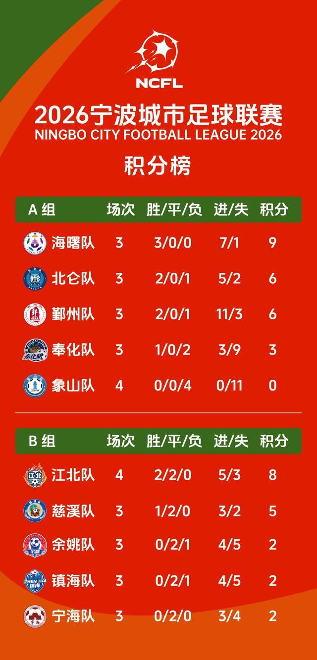 1月25日下午,2026宁波城市足球联赛完成第四轮B组的两场争夺:江北队主场3比2战胜余姚队后,以两胜两平的战绩率先从B组出线;慈溪队2比1战胜宁海队,慈溪队最后一轮只要不输球即可出线。